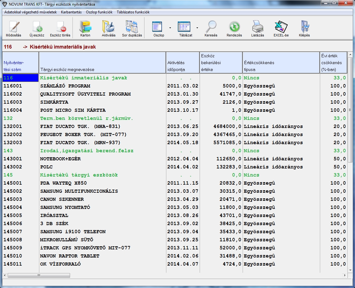 A Nyilvántartások/Tárgyi eszközök nyilvántartása menüpontban (vagy az Eszközök gombra kattintva) lehet felvenni a tárgyi eszközök nyilvántartási adatait (Egyedi nyilvántartólap), és karbantarthatjuk a kartonján szereplő tételek (értékcsökkenés, bruttó változás) adatait.
