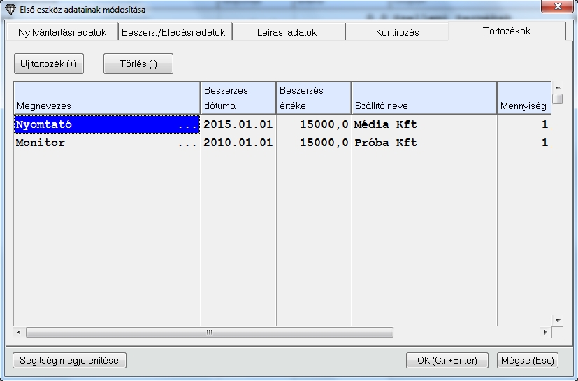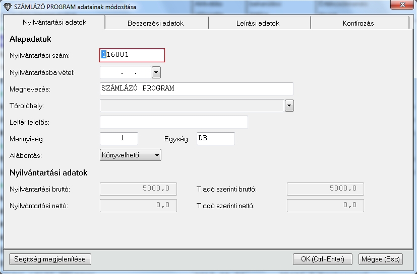 A felvételt "+" gomb lenyomásával vagy ra kattintva tehetjük meg. Ekkor egy új ablakban felugrik a tárgyi eszköz nyilvántartó ablak 5 fülre osztva: Nyilvántartási adatok, Beszerzési adatok / Eladási adatok, Tartozékok/, Leírási adatok, Kontírozás, .