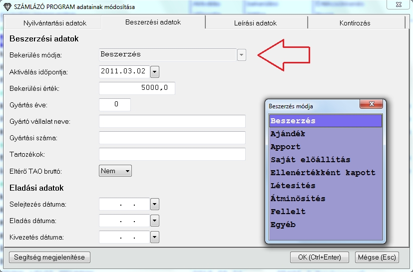 A Beszerzés / Eladási adatok fülön tudjuk felvinni a beszerzés típusát, értékét és az eszköz gyártási adatait valamint mikor az eszköz kifut, eladásra vagy selejtezésre kerül szintén itt tudjuk felvinni az adatait.