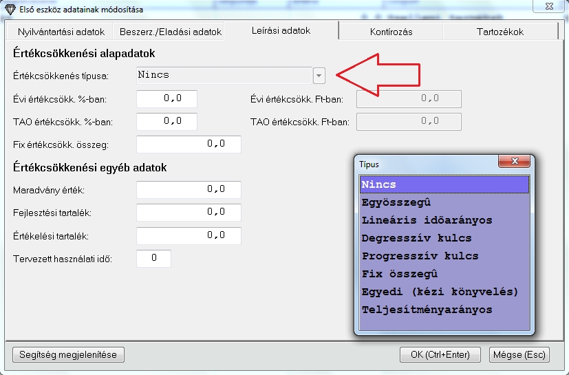 Leírási adatok lapon tudjuk beállítani az adott eszköz leírásának a típusát, százalékát vagy értékét. Ezen felül itt lehet megadni az eszköz Maradvány értékét, Fejlesztési tartalékát, Értékelési tartalékát, a tervezett használati időt, valamint a beruházási adókedvezmény összegét és évét is.