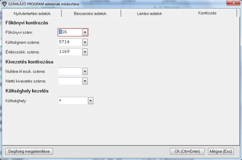 Kontírozási fülön tudjuk beállítani az adott eszközhöz tartozó főkönyvi számokat mely a lekönyveléshez szükséges.