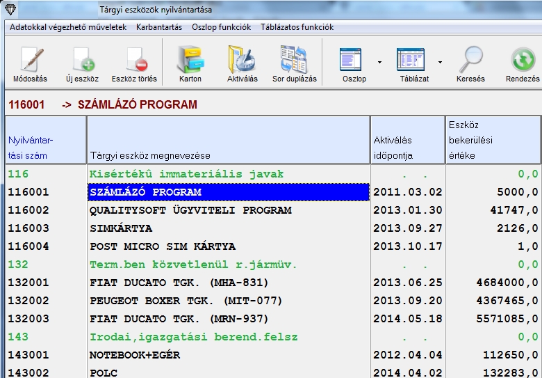 Megváltoztatásához be kell lépni a Nyilvántartások / Tárgyi eszközök nyilvántartása menüpontot. Ebben a menüpontban látja kigyűjtve az összes tárgyi eszközt amit eddig felvitt.