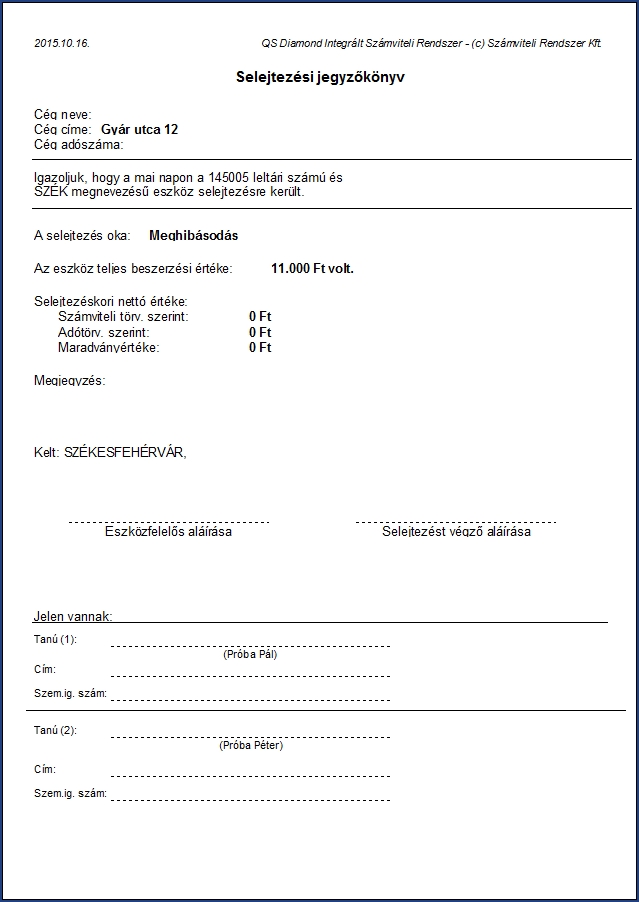 A Listázások/Selejtezési jegyzőkönyv nyomtatása menüpont alatt a leselejtezett eszközök jegyzőkönyvét tudja kinyomtatni. A menüpont lefuttatásakor a program bekéri a selejtezés okát, valamint a 2 tanú nevét. A nyomtatványon szerepelnek a cég adatai, az eszköz neve és leltári száma, a selejtezés oka, valamint a selejtezéskori nettó értéke (Számviteli törvény szerint, Adótörvény szerint, Maradványértéke).