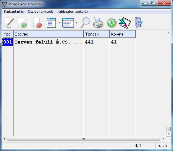 A menüpontot elindítva megkapjuk az összes eddig felvitt mozgásunkat és itt tudunk felvinni újakat is. Felvenni a , törölni a  és módosítani a  gombbal lehet.