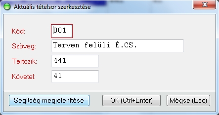 Felvétel és módosítás során az alábbi ablak jelenik meg. Ebben az ablakban tudjuk megadni a kódját (Ez azért fontos mert a későbbiekben könnyeben tudunk rá keresni és a program ez alapján teszi sorba a karton jogcímeket.) valamint az elnevezését és a tartozik és követel oldalát.