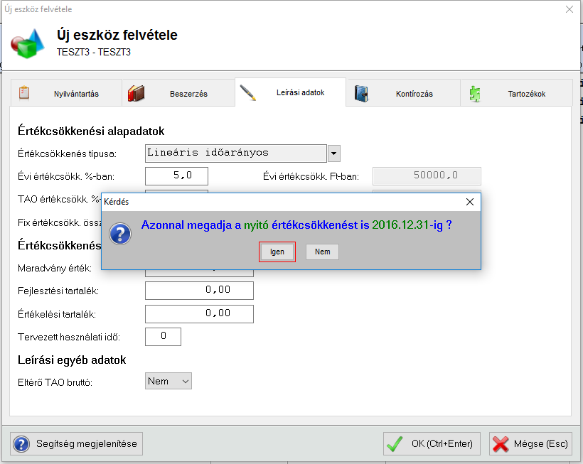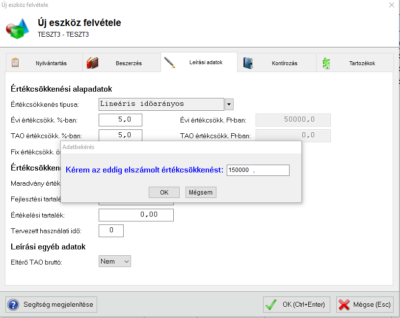Van azonban olyan lehetőség is, hogy az eszköz felvitelekor a programmal automatikusan rögzítteti le a már elszámolt értékcsökkenéseket. Önnek csak az értékcsökkenés összegét kell megadnia.