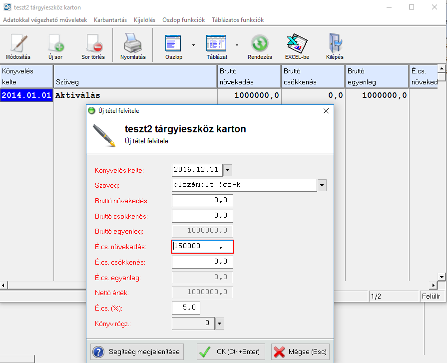 Ezután [+] gomb segítségével vigyék fel a 2016.12.31-ig elszámolt értékcsökkenést. Az értékcsökkenés összegét az écs növekedés mezőbe vigyék fel.