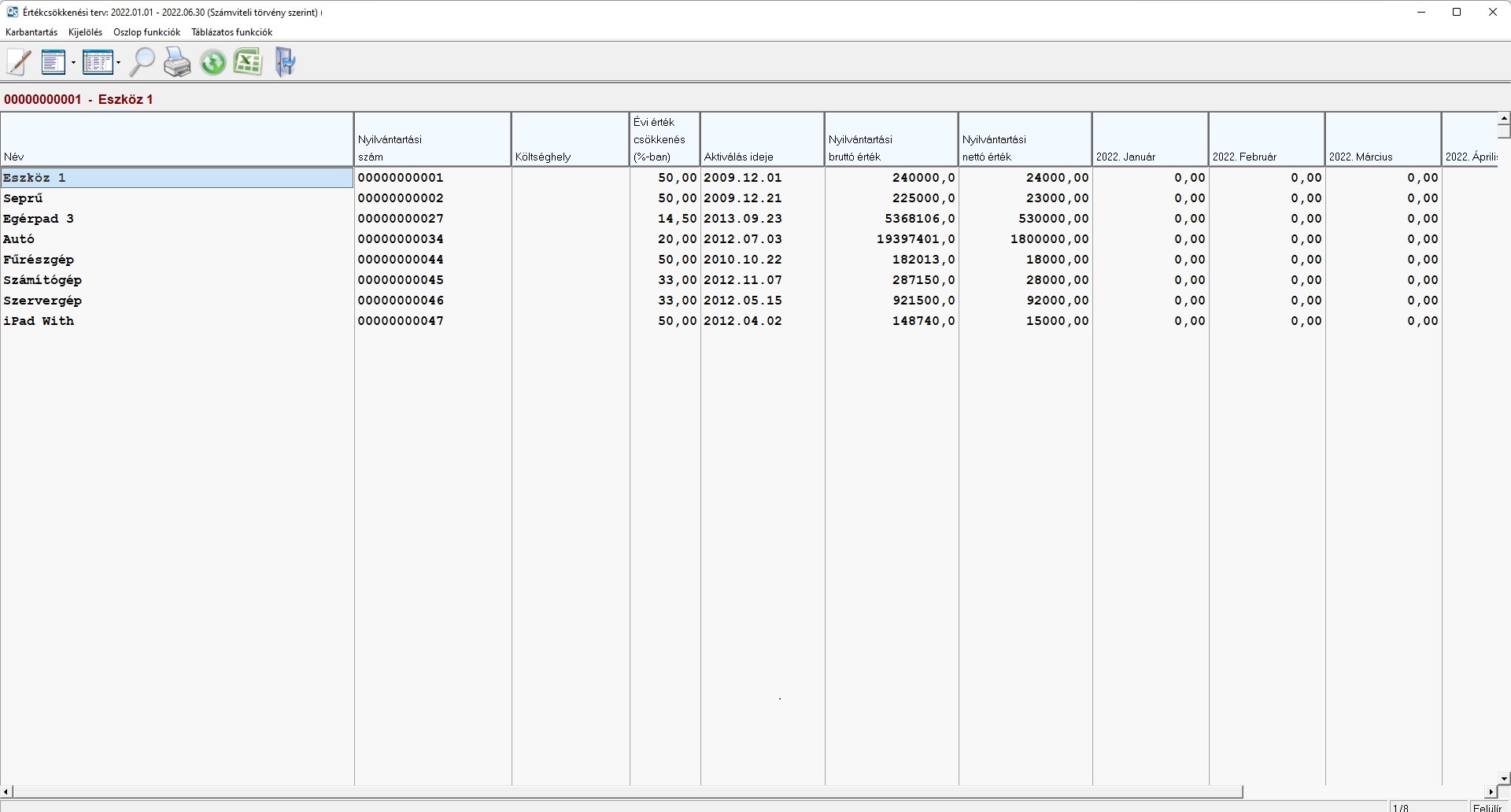 Az eredményt egy táblázatban tekinthetjük meg. Itt annyi értékcsökkenés oszlopot fogunk látni, ahány hónapra indítottuk a tervezést.