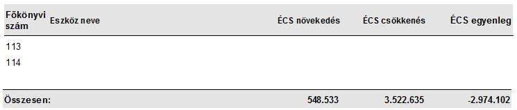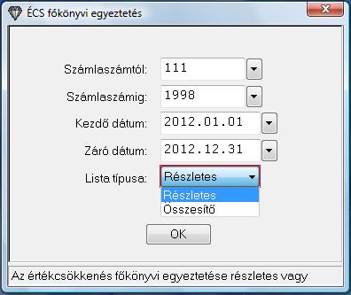 Listázások/ÉCS főkönyvi egyeztetés listával az elszámolt értékcsökkenéseket lehet egyeztetni a tárgyidőszakon belül. Nagy segítséget nyújt az egyeztetésben, hibakeresésben, mert az időszak nyitó egyenlegét is mutatja. A listát az adott időszakra, lekérheti egy-egy főkönyvi számra összesítve, vagy főkönyvi számok szerint részletezve is.