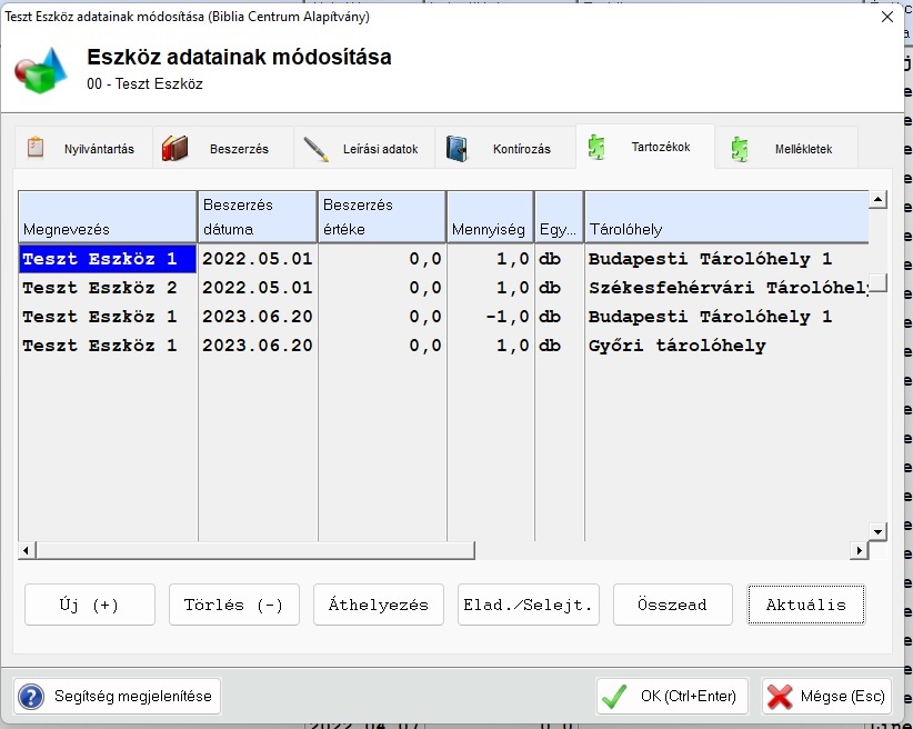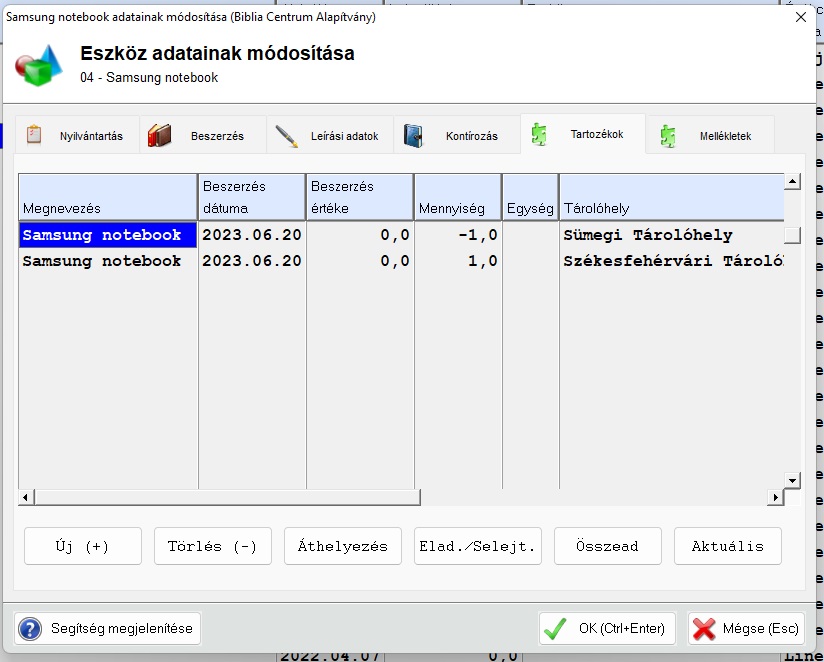 Ha már van felvéve tartozék akkor a tárolóhely változást a már létező tartozékoknál kell lekezelni. Itt legegyszerűbb az Áthelyezés gombot használni, megadni hogy honnan és hova helyeztük át, a mennyiséget és a dátumot. A program ezután felveszi a két új sort. (Az egyik mínuszosan csökkenti az eredeti tárolóhelyen lévőt és hozzáadja az újhoz) Így kerül naplózásra a tárolóhelyek változtatása. Ha a nem a darabonként külön tárolóhelyen szerinti használati módot követjük, akkor a naplózás nem fog megfelelően működni.