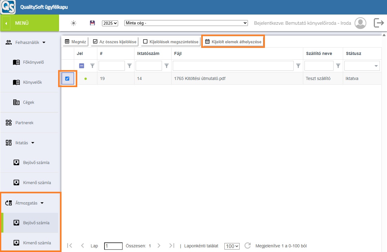Abban az esetben ha nem a megfelelő évbe történt az adott kimenő vagy bejövő számla feltöltése van mód arra hogy a megfelelő évbe mozgassuk a dokumentumokat. Ehhez az "Átmozgatás" gombra klikkelve ki kell választani a "Bejövő számla" vagy a "Kimenő számla" lehetőséget, majd a megjelenő listában a sorok elején látható jelölőnégyzet bepipálásával ki tudjuk választani azt/azokat a bizonylatokat amit/amiket szükséges átmozgatni másik évbe.