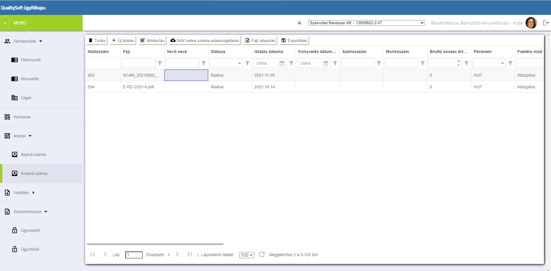Bal oldalt az Iktatás fül lenyitása után láthatjuk a Bejövő és a Kimenő számla menüpontokat. Itt iktathatjuk a számlákat. A táblázat felett található gombok közül a „ NAV Online számla adatszolgáltatás” segítségével tudjuk lekérni a NAV szerveréről az oda beküldött számlákat. Ehhez szükséges hogy a NAV technikai felhasználó adatait megadjuk. (Jobb felső sarokban található fogaskerék ikon)