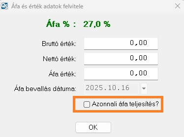 3. Az előírás rögzítésekor az ellenoldalon (alsó tábla) az érték mezőn enterezve megjelenő ablakban található egy "Azonnali áfa teljesítés?" jelölőnégyzet ha ezt bepipálják, akkor az áfa teljesítés dátuma a számviteli teljesítés dátuma.