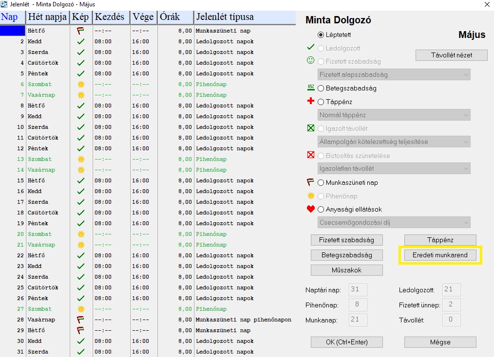 Fontos! Amennyiben a dolgozó volt szabadságon vagy volt kieső ideje (például táppénz) akkor ezeket szükséges újból rögzíteni. Az "Eredeti munkarend" gombra klikkelve ezek törlődnek.