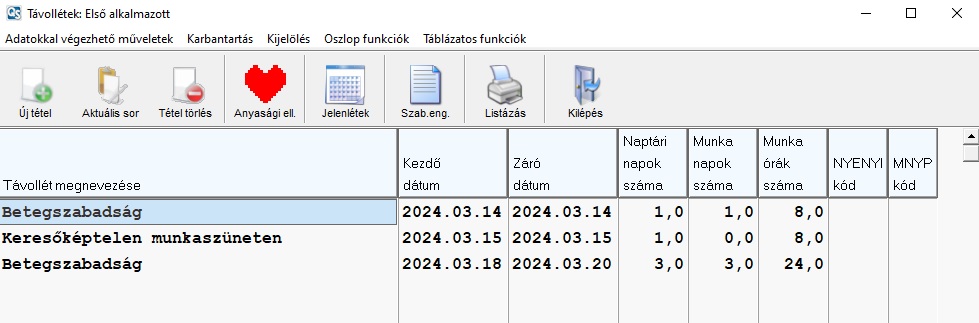 Bármelyik felviteli mód mellet is döntünk a lépések eredményeként a távollétek felvitele menüben a képen látható soroknak kell megjelenni
