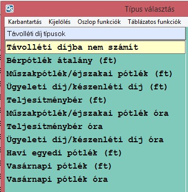 FONTOS! Megjegyzés: A Jogcímtörzs karbantartása Távolléti díj típus oszlopában láthatjuk (eléréséhez a jobbra nyílat kell megnyomni, míg meg nem jelenik), hogy a távolléti díj számításánál pontosan mely jogcímek vannak figyelembe véve. Ha Ön azt szeretné, hogy valamelyik jogcím beleszámítson, vagy ne számítson bele, akkor az adott jogcím sorában ennek a mezőnek az értékén nyomjon Entert és a feljövő Típus lista ablakban válassza ki az Önnek megfelelő távolléti díj típust.