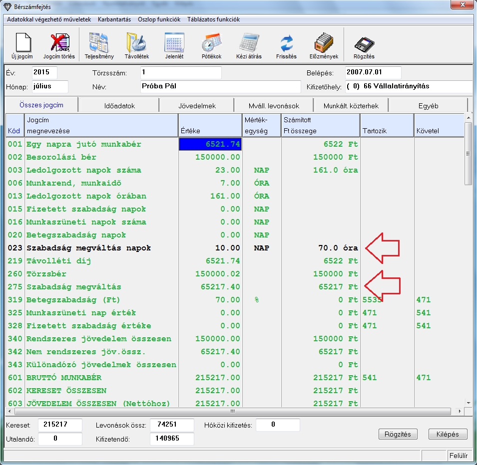 Önöknek más teendőjük nincs, mint ez esetben a dolgozó bérszámfejtésekor a [+] gombbal fel kell venniük a 023-as Szabadság megváltás napok száma jogcímet, és itt meg kell adnia a kifizetni kívánt napok számát. Valamint a 275-s Szabadság megváltás jogcímet, melybe kiszámítódik a távolléti díj segítségével a szabadságok értéke. Az alábbi képen látható a két jogcím. Ez első jogcím fekete, ezt önöknek kell kitölteni (meg adni a kifizetni kívánt szabadság napok számát) és a második jogcímen kiszámolódik automatikusan, ez a jogcím zöld amely jelzi, hogy automatikusan számolódik a jogcím.