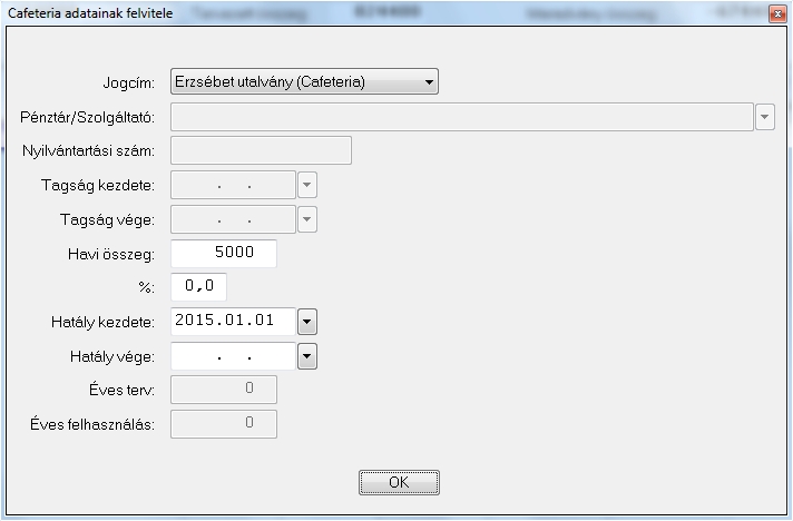 A Cafeteria kezelés cikkünkben olvashatott róla, hogy hogyan és hol érhető el a programban a Cafeteria adatok. A Cafeteria felvitelénél minden cafeteria jogcímnél az alábbiak a nyilvántartott adatok :