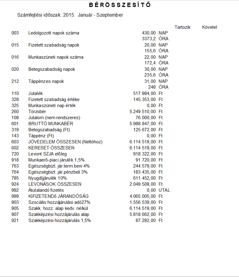 A Listázások/Bérösszesítő lista menüpontnál megadott hónapokra számfejtett jogcímek összesített értékét listázza ki. Akár szervezeti egységre bontva is le tudja kérni. Kiválóan alkalmas hatósági adatszolgáltatási kötelezettség alapadatainak kigyűjtésére, főkönyvi egyeztetésre stb. Ön egyedileg be is tudja paraméterezni, hogy ezen a listán pontosan mely jogcímek szerepeljenek.