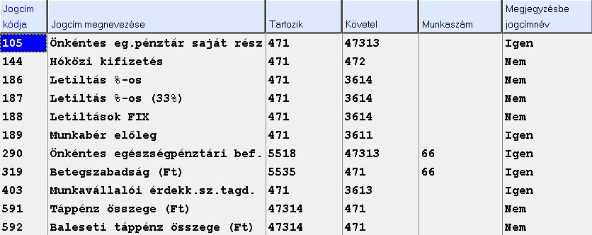 A Törzsadatok/Bérfeladási paraméterek karbantartása menüpontban minden egyes jogcímhez hozzárendelhető egy Tartozik főkönyvi szám, valamint egy Követel főkönyvi szám. A Bérfeladás főkönyvnek című cikkünkben olvashat róla részletesen, hogy mi célt szolgálnak valamint, hogy hogyan állíthatók be ezek az oszlopok.
