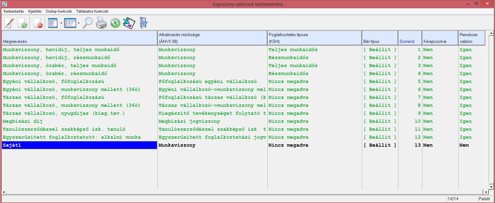A programhoz tartoznak rendszersablonok (mint például a fentiek), de a felhasználók is létrehozhatnak saját sablonokat. Erre a Törzsadatok / Jogviszony sablonok karbantartása menüpontban van lehetőség.
