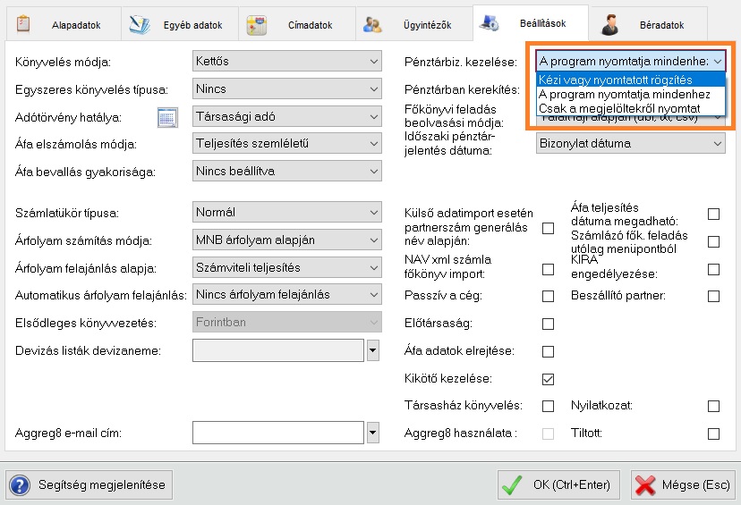Legelőször is a könyvelendő cégek karbantartása menüpontban cégenként meg lehet adni, hogy a pénztárbizonylatok kezelése hogyan történjen az adott cégben.