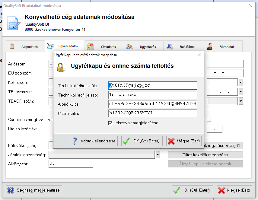 Az adatok tesztelése gombbal ellenőrizheti a bevitt jelszó és a csere és aláírókulcsok helyességét.