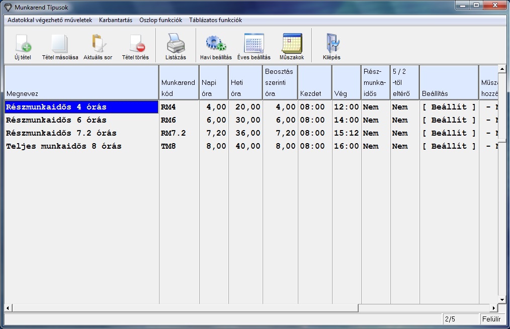 Menüpont elindítása után egy táblázat formájában megkapjuk az eddig felvitt és alap munkarend típusainkat. (Táblázatok használatáról bővebben itt olvashat.)
