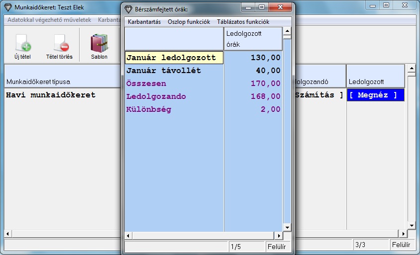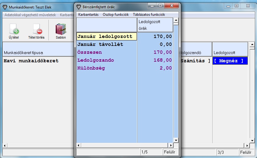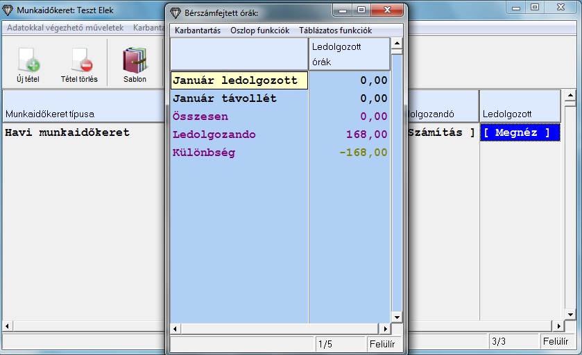 A Ledolgozott oszlopra kattintva egy felugró ablakban láthatom a már rögzített bérszámfejtések alapján az abban a hónapban ledolgozott órák számát, illetve a felhalmozott pihenőidőt. A keretbe tartozó korábbi bérszámfejtéseket újra meg kell nyitnom és le kell rögzítenem, hogy a munkaidőkerethez tartozó adatokat is kiszámolja a program.