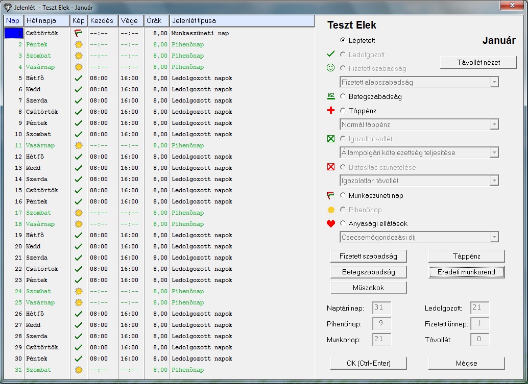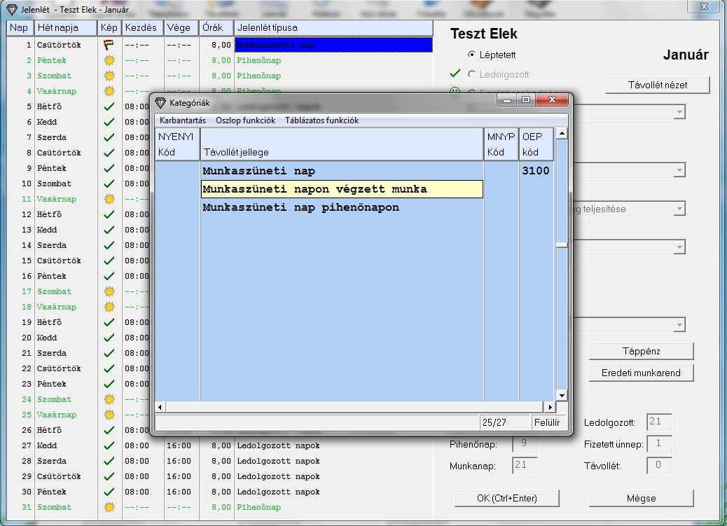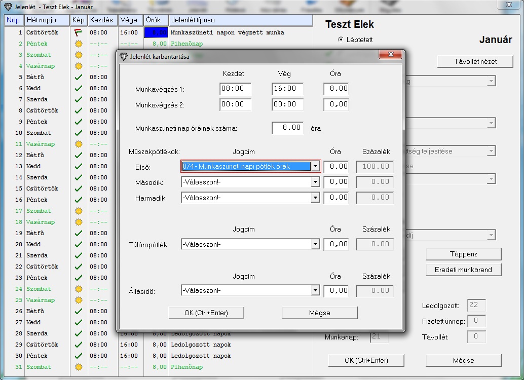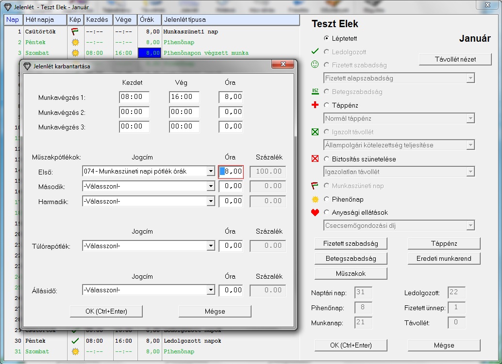 Módosítsuk a jelenlétet: Január 1. a munkarend szerint munkaszüneti nap. Ezt 8 órás munkanapként fogom felvenni, és 100%-os munkaszüneti napi pótlékot veszek fel erre a napra.