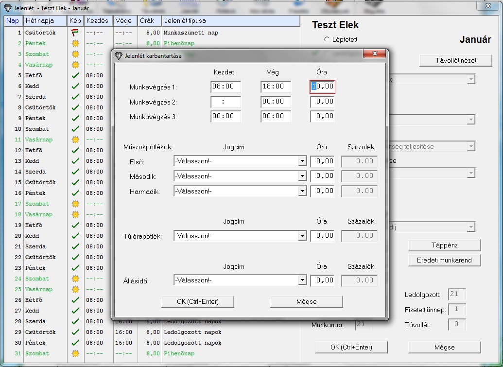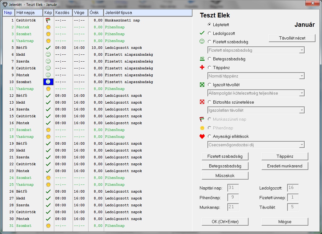 Módosítsuk a jelenlétet: Január 5. a munkarend szerint 8 órás munkanap, amit a jelenlétben átírok 10 órás munkanapra.