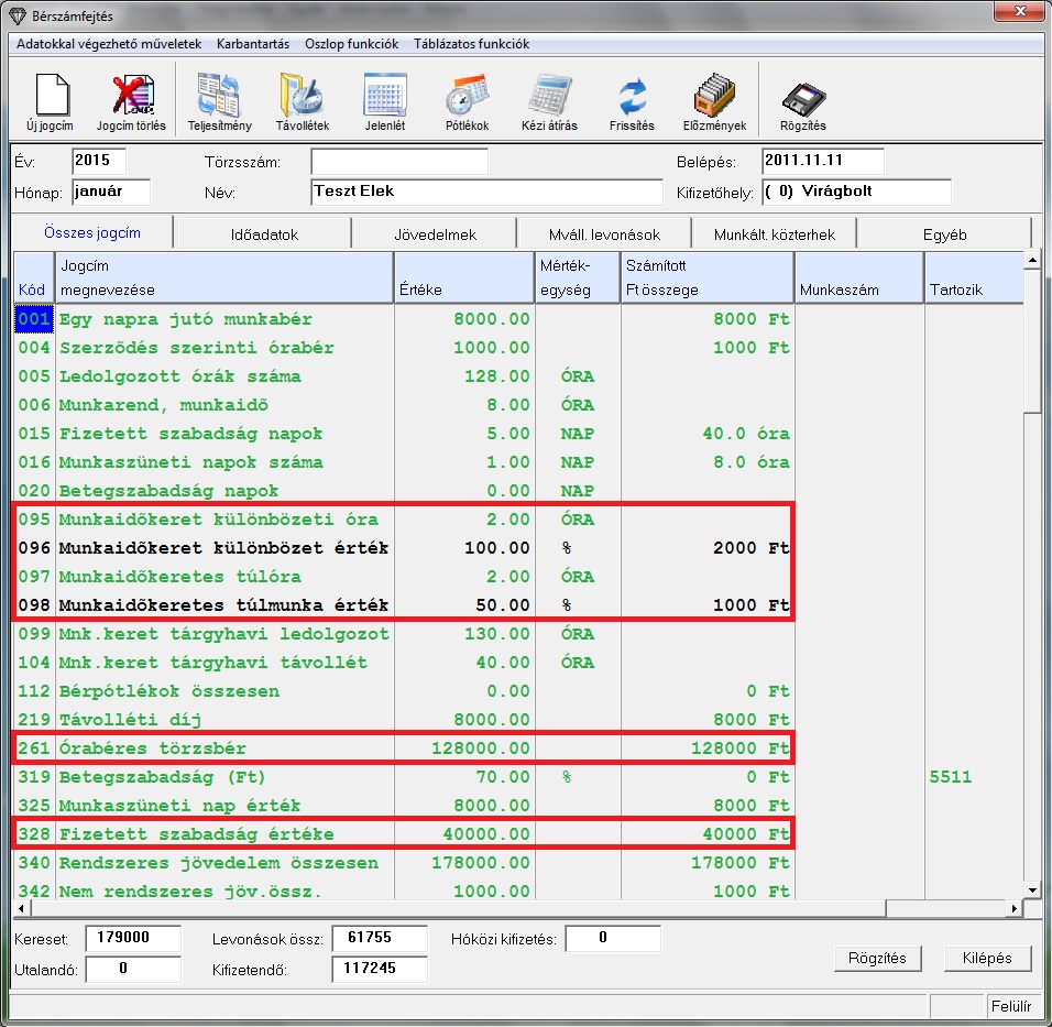 A 005-ös jogcímen az alkalmazott munkarend szerinti óraszáma jelenik meg, és ez alapján számolódik ki az alkalmazott törzsbére a munkaidőkeret minden hónapjában. Ebben az esetben csak 16 munkanap van a hónap során, amelyekre a munkarend szerinti órák száma 128.