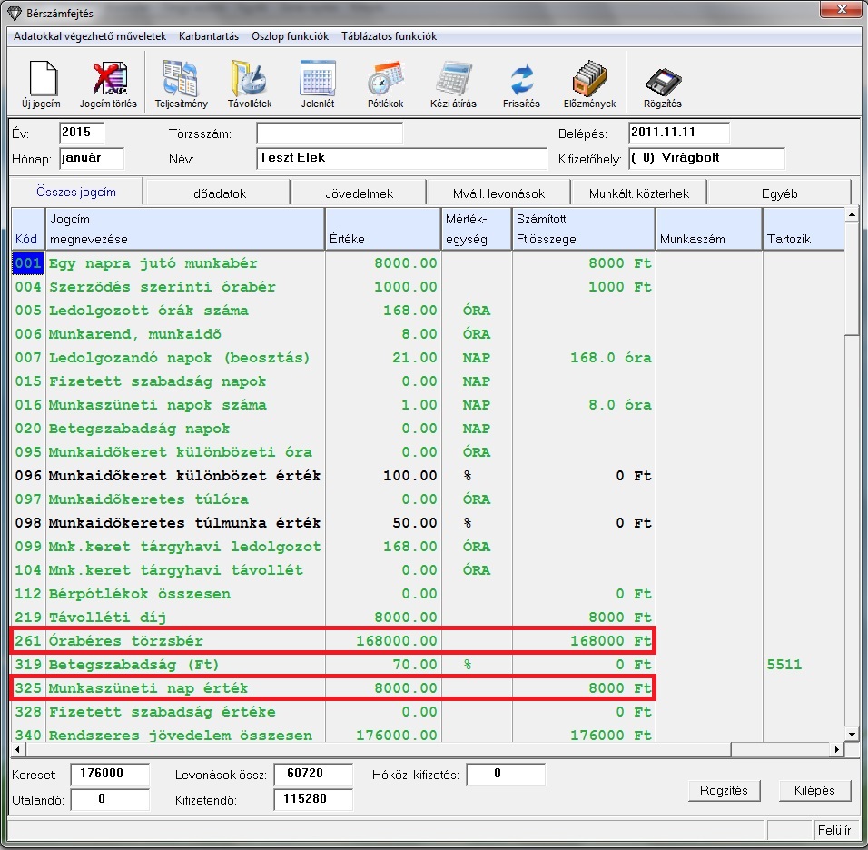 A munkaszüneti napon történő munkavégzés bére mellé az órabéres alkalmazott 1 napi távolléti díjat is kap. A munkaszüneti napok száma a 016-os jogcímen jelenik meg, a munkaszüneti napokra számolt távolléti díj pedig a 325-ös jogcímen jelenik meg.