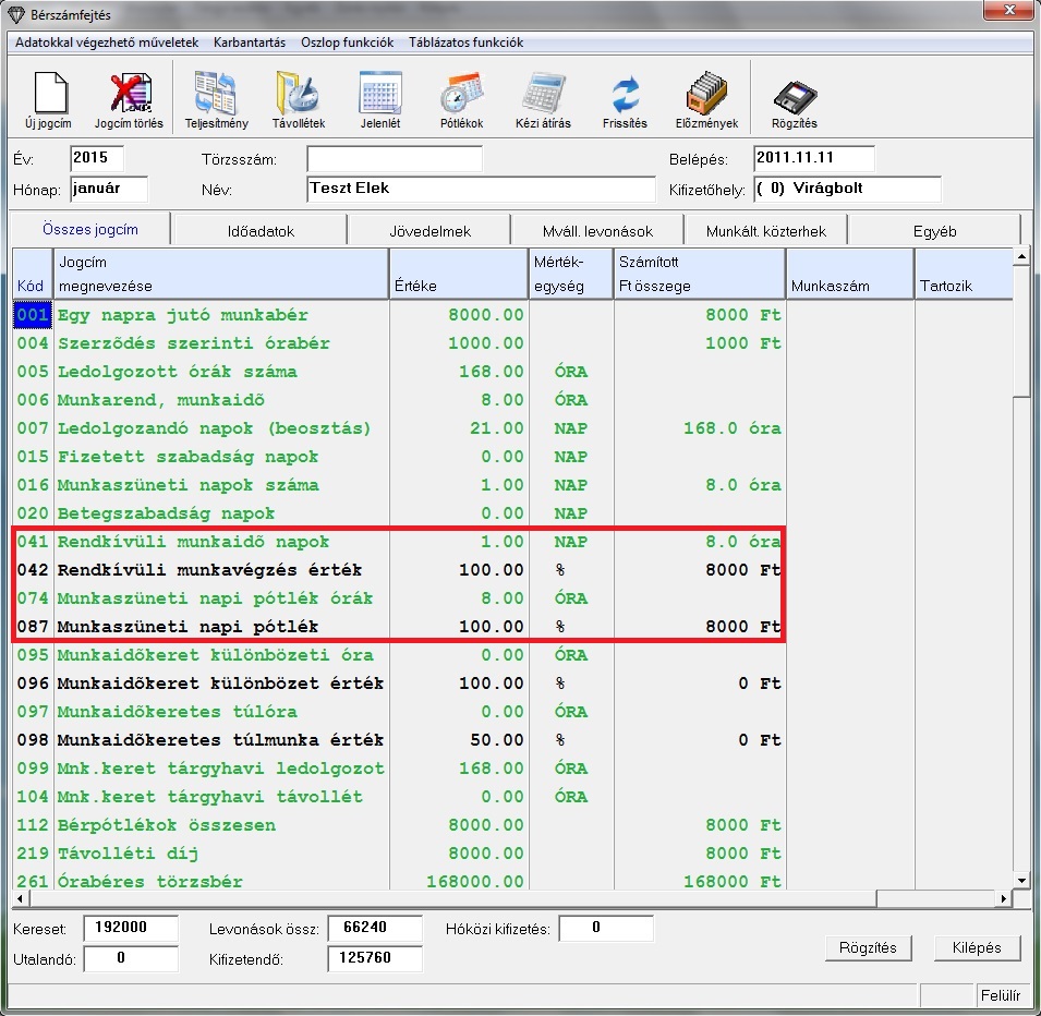 A rendkívüli munkaidő órái alapján számolt bér a 042-es jogcímen jelenik meg.