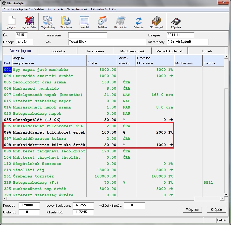 A munkaidőkeret utolsó hónapjában a kifizetett órák, és a ténylegesen ledolgozott órák különbsége a 095-ös jogcímen jelenik meg, az ez alapján kifizetendő, vagy levonandó összeg pedig a 096-os jogcímen számolódik ki.