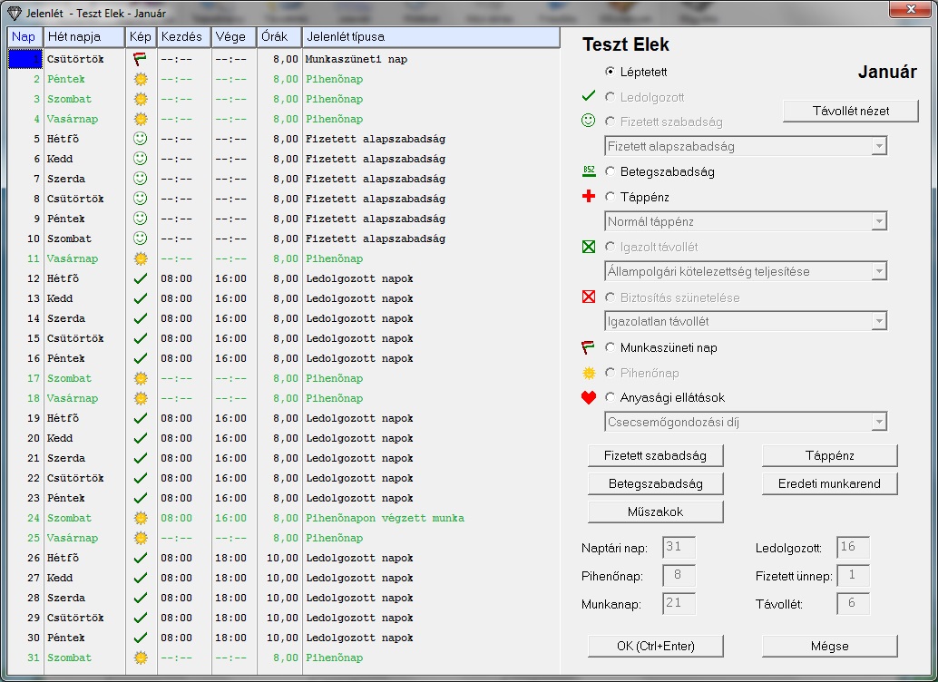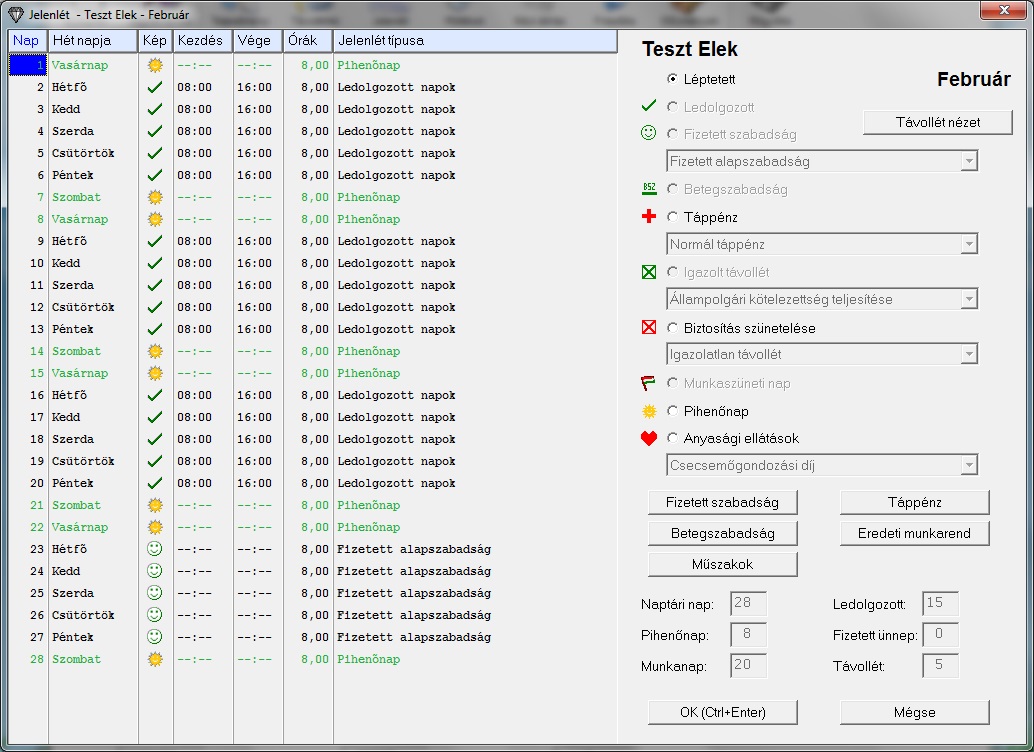 A példa kedvéért felvettem a programban Teszt Elek nevű alkalmazottat aki 1000Ft-os órabérben dolgozik Teljes munkaidős 8 órás munkarend szerint.