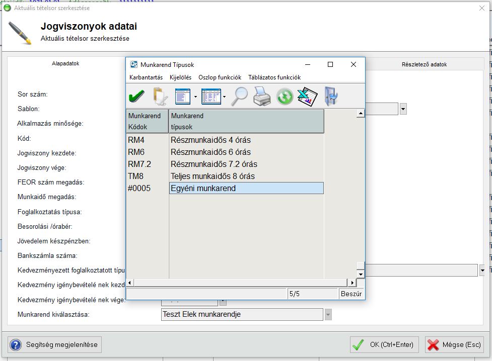 A példa kedvéért felvettem a programban Teszt Elek nevű alkalmazottat aki 180.500Ft-os havidíjjal dolgozik.