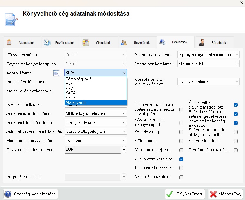 Az adózási forma ellenőrzéséhez vagy módosításához lépjen be a Karbantartás/ Könyvelhető cégek karbantartása menüpontba, majd a kiválasztott cégen állva lépjen be a módosításba és a Beállítások fülön az Adózási forma fülön válassza ki a megfelelő lehetőséget.