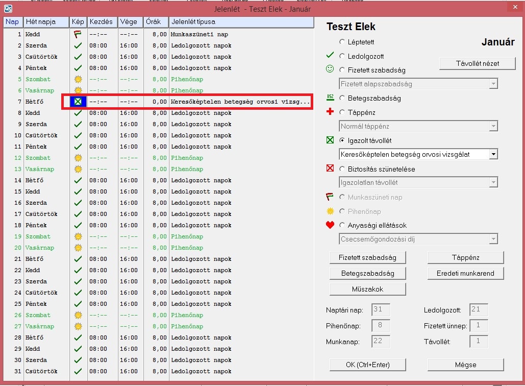 2. A dolgozónál az adott hónapra ideiglenesen egyedi munkarendet állítunk be, amelyben a megfelelő nap munkanap, de az időtartam 0 óra.