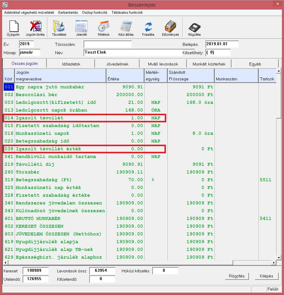 1. A 038-as Igazolt távollét érték jogcímnél az értéket kézi módosítással kinullázzuk.