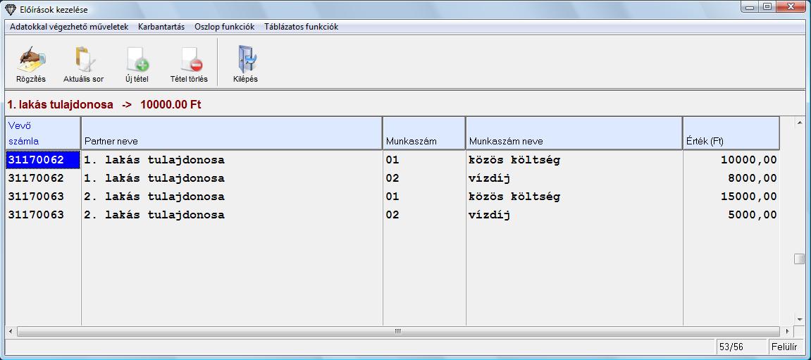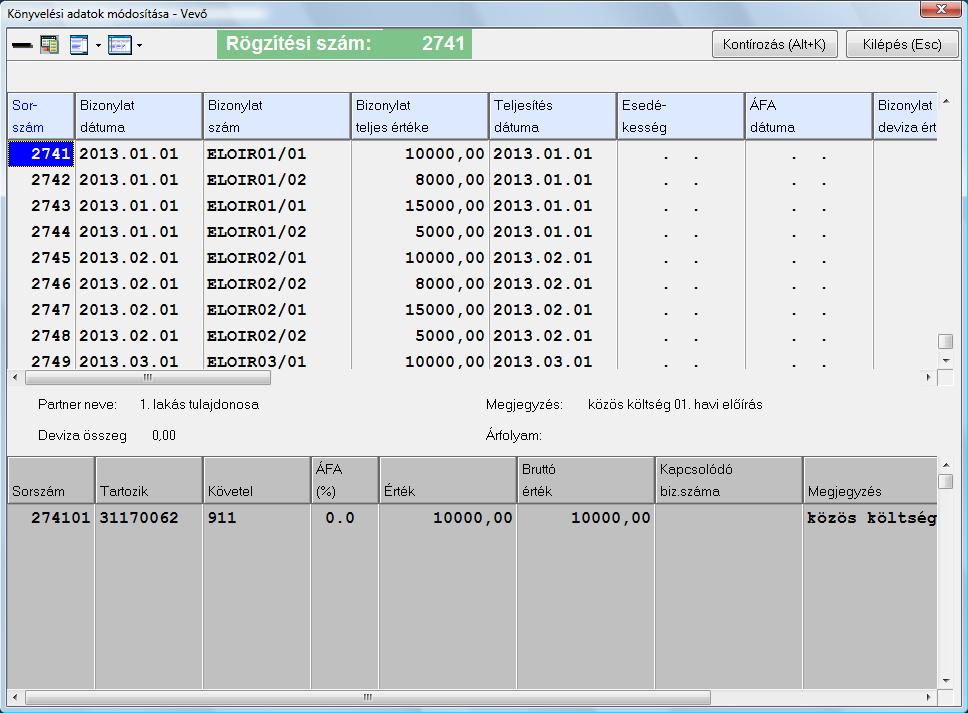 Nullás áfa mentes tételek fognak berögzülni. A lekönyvelődött tételeket az Egyéb/Könyvelt tételek módosítása/Vevő naplóban láthatja "ELOIR" kezdetű bizonylatszámmal (bizonylatszám: ELOIR'HÓNAP/'KÖLTSÉG FAJTA KÓD''). Ha az Előírások kezelésénél nincs kitöltve a költség fajta kódja, akkor nem rögzül le az előírás. Erről a program figyelmeztető üzenetet is küld. Ha az adott hónapra könyvelt már előírást, akkor nem rögzíti le az adott hónapot addig, míg ki nem törli a korábban lerögzített automatikus előírásokat.