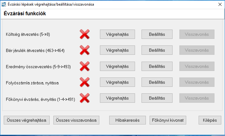 Itt minden zárási funkciót betudunk állítani, végre hajtatni és visszavonni. Az ablak alján tudunk lekérni főkönyvi kivonatot vagy akár az összeset egyszerre végre hajtani vagy visszavonni.