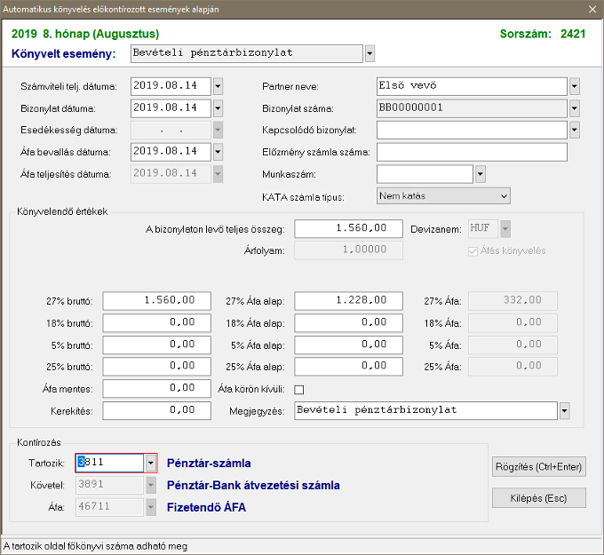 Megjegyzés: A 390-es és a 391-es rendszerparaméterekkel szabályozható, hogy a könyvelt tétel bizonylatszáma a pénztárbizonylat száma legyen, vagy kézzel megadható. A két rendszerparaméterről bővebben itt olvashat: Rendszer paraméterek (Házi pénztár)