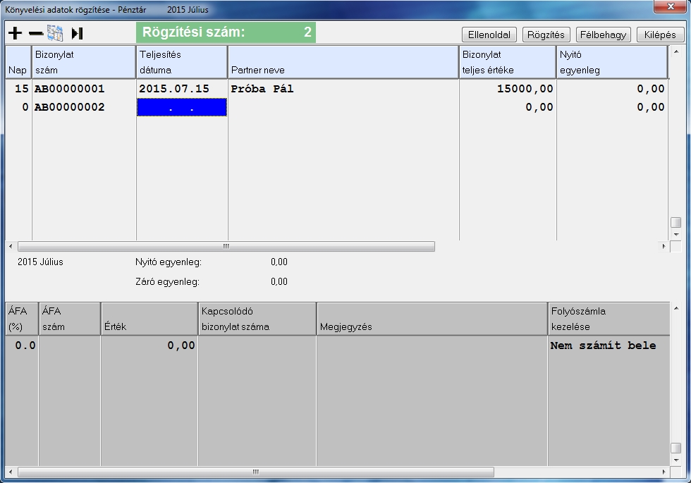 Az alábontásban tudjuk kitölteni az áfa sort. Az alábontás oszlopait értelemszerűen kitöltve a rögzít gomb lenyomásával tudjuk rögzíteni.
