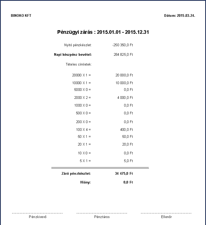 Az adatok megadása után a program elkészíti nyomtatható formában az adott pénztárban történt pénztármozgások időszaki pénztárjelentését. Automatikusan meghatározza a nyitó, valamint a záró pénzkészletet. Jelentés készülhet az adott intervallumon belül naponta vagy összesen.