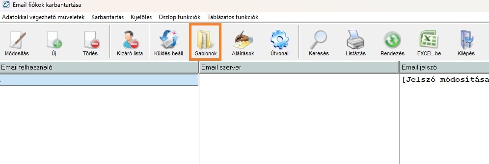 Az itt megjelenő ablakban először ki kell választani azt az adott email címet, amihez hozzá szeretnénk rendelni a sablont, majd ezután a Sablonok ikonra klikkelve egy újabb ablak fog megjelenni.
