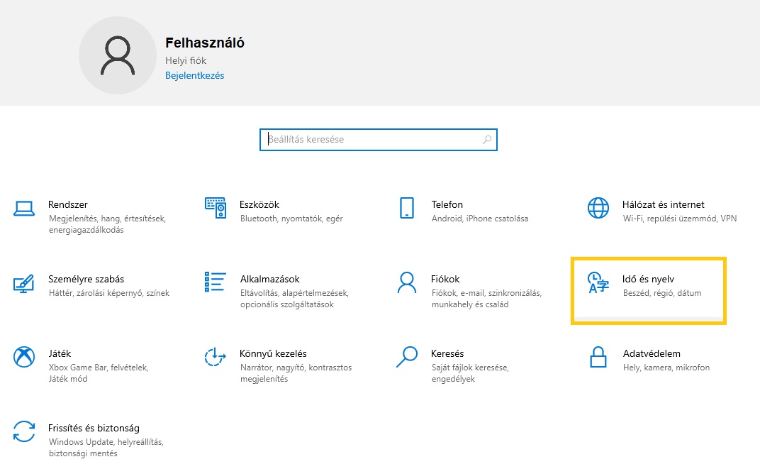A régió beállítás elvégzéséhez a gépházba belépve az "Idő és nyelv"-re szükséges klikkelni.