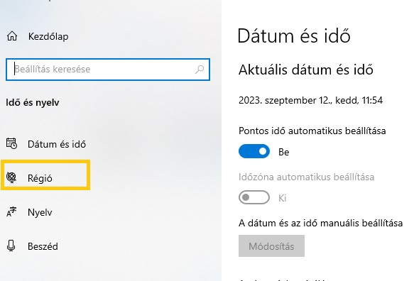Az idő és nyelv beállításokon belül a jobb oldalon megjelenő listában a "Régió"-ra klikkelve nyílik meg a kívánt felület.