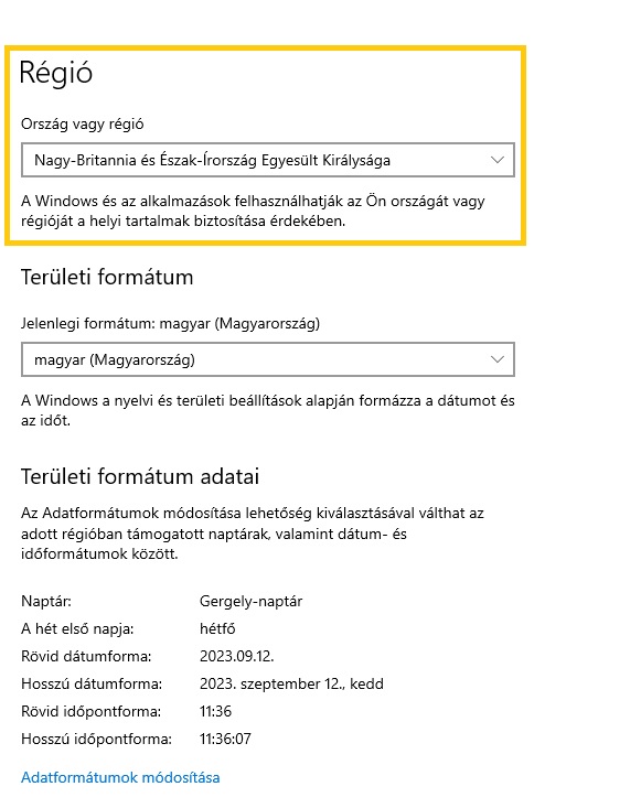 A megjelenő felületen az "Ország vagy régió" mezőbe Magyarországot kell beállítani.