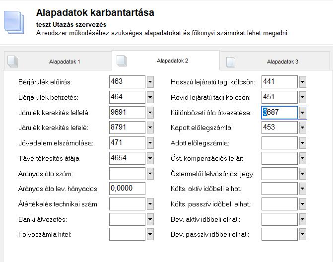 Második lépésként ki kell tölteni a megfelelő főkönyvi számmal a "Különbözeti áfa átvezetése" mezőt a "Kilépés/Gyors menü/Rendszer működési alapadatok (alap működéshez)" menüpontban.